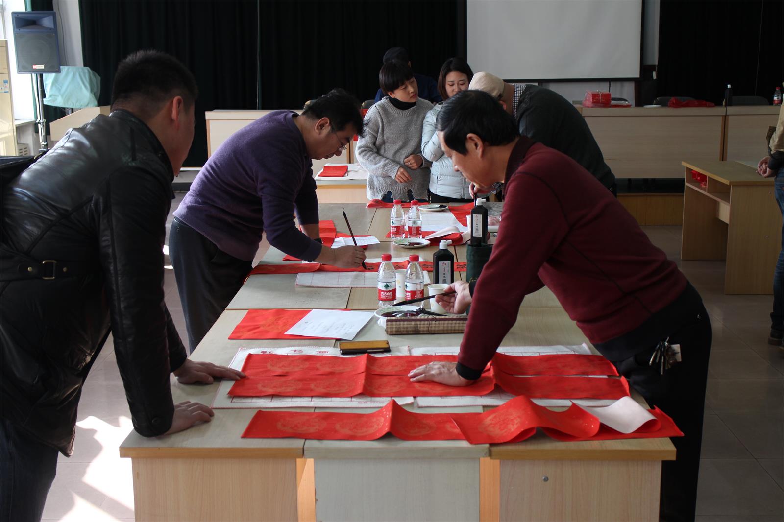 今年當(dāng)然也不能例外!2月2 日下午15 點至 17 點30分,市書法家協(xié)會的多位優(yōu)秀書法家準(zhǔn)時來到五樓會議室為本院職工們免費書寫春聯(lián),大伙兒熱情很高, 現(xiàn)場氣氛歡快,不一會兒各色字體,不同內(nèi)容的大紅春聯(lián)就鋪滿了各個角落。